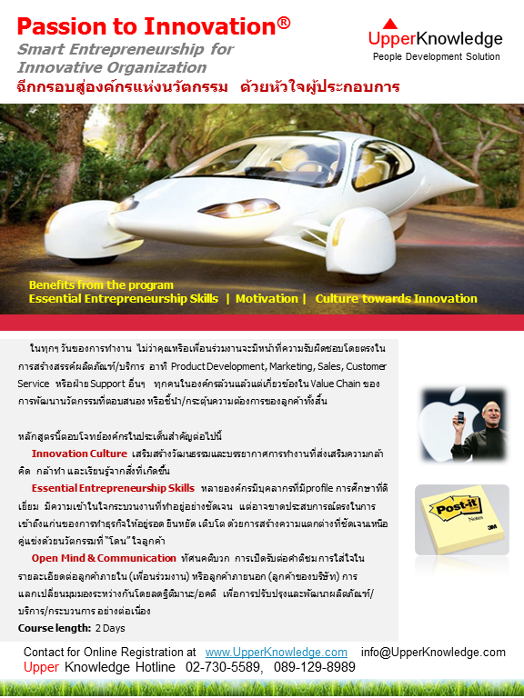 | Smart Entrepreneurship for Innovative Organization (Passion to Innovation)ฉีกกรอบสู่องค์กรแห่งนวัตกรรม ด้วยหัวใจผู้ประกอบการ |