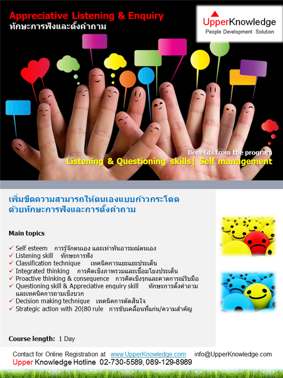Main topics - Self esteem การรู้จักตนเอง และเท่าทันอารมณ์ตนเอง - Listening skill ทักษะการฟัง - Classification technique เทคนิคการแยะแยะประเด็น - Integrated thinking การคิดเชิงภาพรวมและเชื่อมโยงประเด็น - Proactive thinking & consequence การคิดเชิงรุกและคาดการณ์รับมือ - Questioning skill & Appreciative enquiry skill ทักษะการตั้งคำถาม และเทคนิคการถามเชิงบวก - Decision making technique เทคนิคการตัดสินใจ - Strategic action with 20|80 rule การขับเคลื่อนที่แก่น/ความสำคัญ